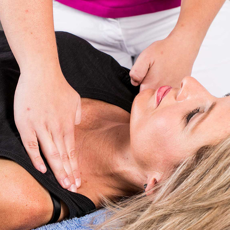 Drenaż limfatyczny dodatkowo wspiera efekt terapii uciskowej. To specjalna technika masażu, w której terapeuta wykonuje delikatne, rozciągające skórę ruchy – znana jako ręczny drenaż limfatyczny. Pacjent może się również nauczyć uproszczonej wersji tej techniki i wykonywać ją samodzielnie, zazwyczaj w drugiej fazie terapii. Nazywa się to prostym lub samodzielnym drenażem limfatycznym (ang. simple lymphatic drainage, SLD).